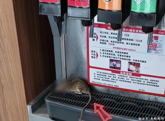 网友发布的图片显示,一只老鼠俯卧在饮料机接水盘的最左侧。该网友配文称,“之前刷到过魏家,下了高铁就近找一个吃,吃完了发现一个老鼠就这么水灵灵地喝可乐。”