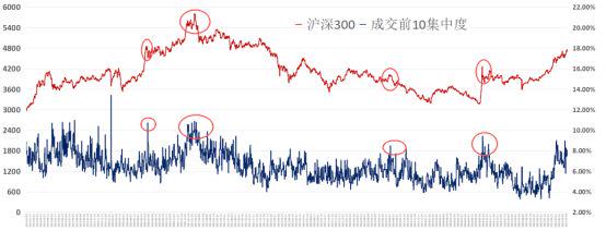 这里有张图,从2019年至今,虽然行情高点不一定反映出偏高的交易集中度,但是偏高的交易集中度基本都对应着行情阶段高点。