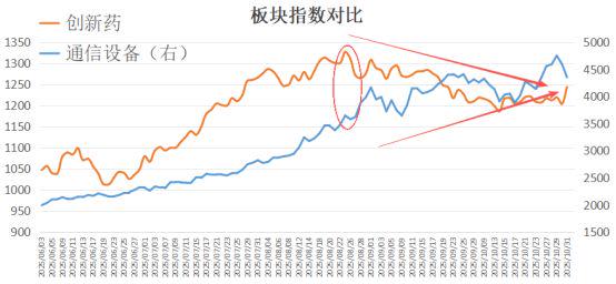 往大的方向来讲,行情存在红利与科技的跷跷板效应,但是科技内部也存在跷跷板效应,那就是通信设备与创新药。