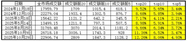 从去年9月24日至今,剔除2024年10月8日,选取了7个行情的阶段高点,然后统计成交额前5、前10、前20的交易集中度。我们会发现,该指标都普遍偏高,尤其是在10月29日的时候,这个维度的交易集中度都超过了前6个阶段高点。当时,小二把这个当风险点特意做了提示。